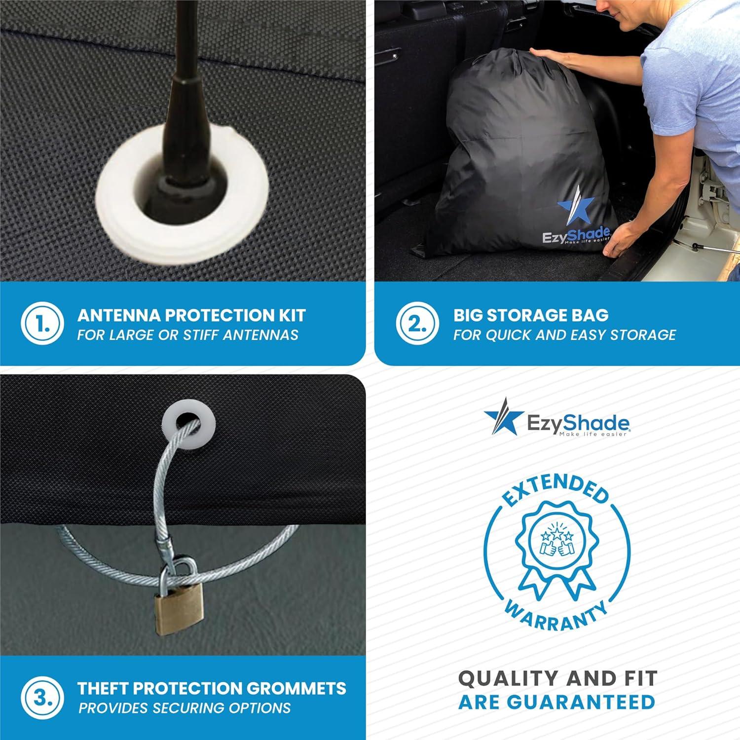 100% WEATHER-PROOF. Durable weather-proof materials and heavy-duty reinforced stitching combine with EzyShade’s custom-like fit guarantee to produce a cover that is waterproof, windproof, snowproof, dustproof, 100% sun and UV protective, and scratch resistant.