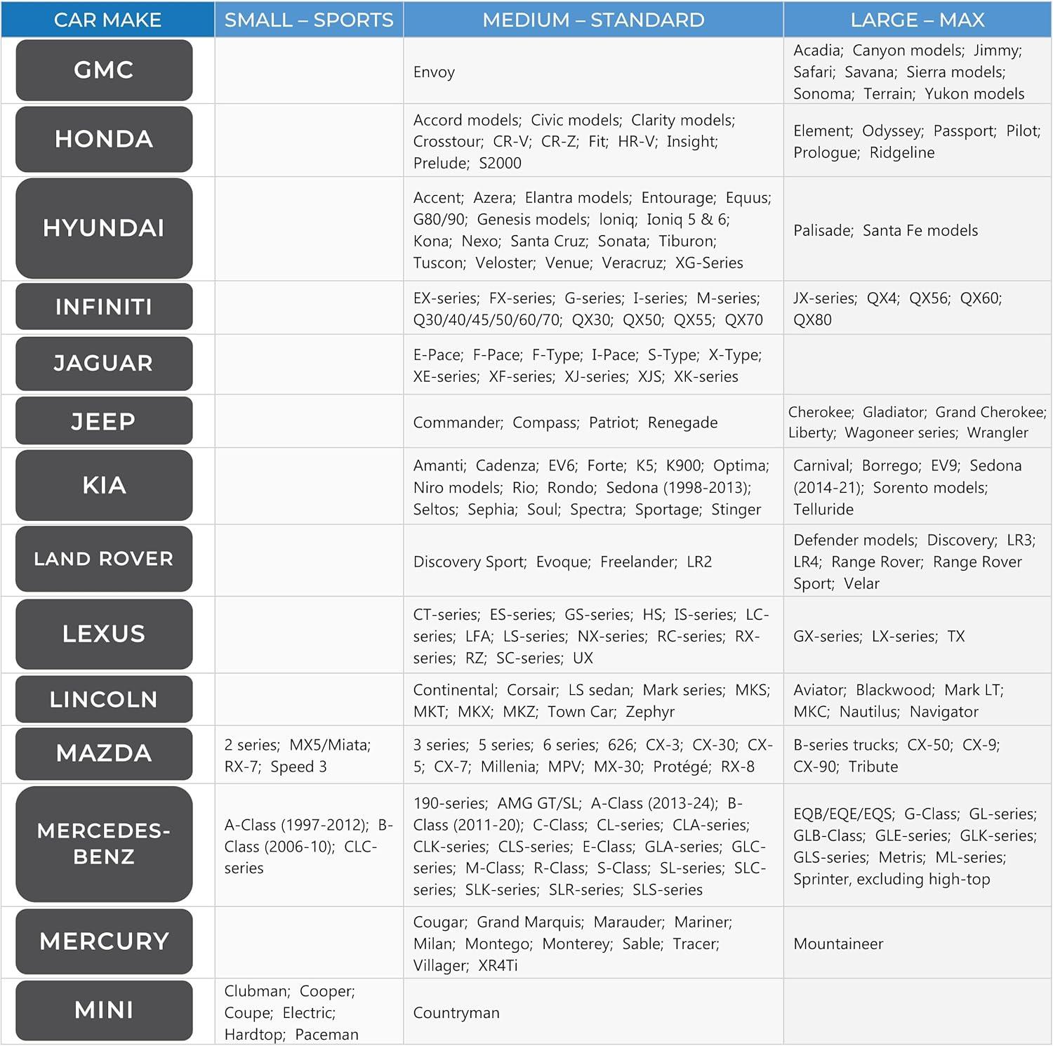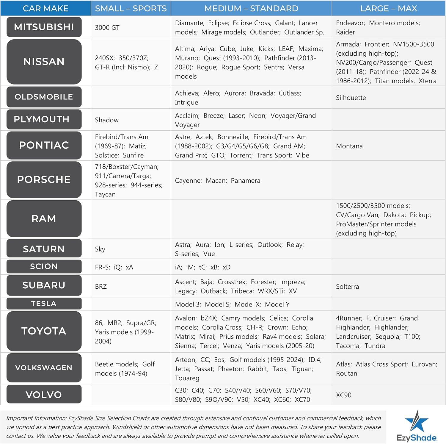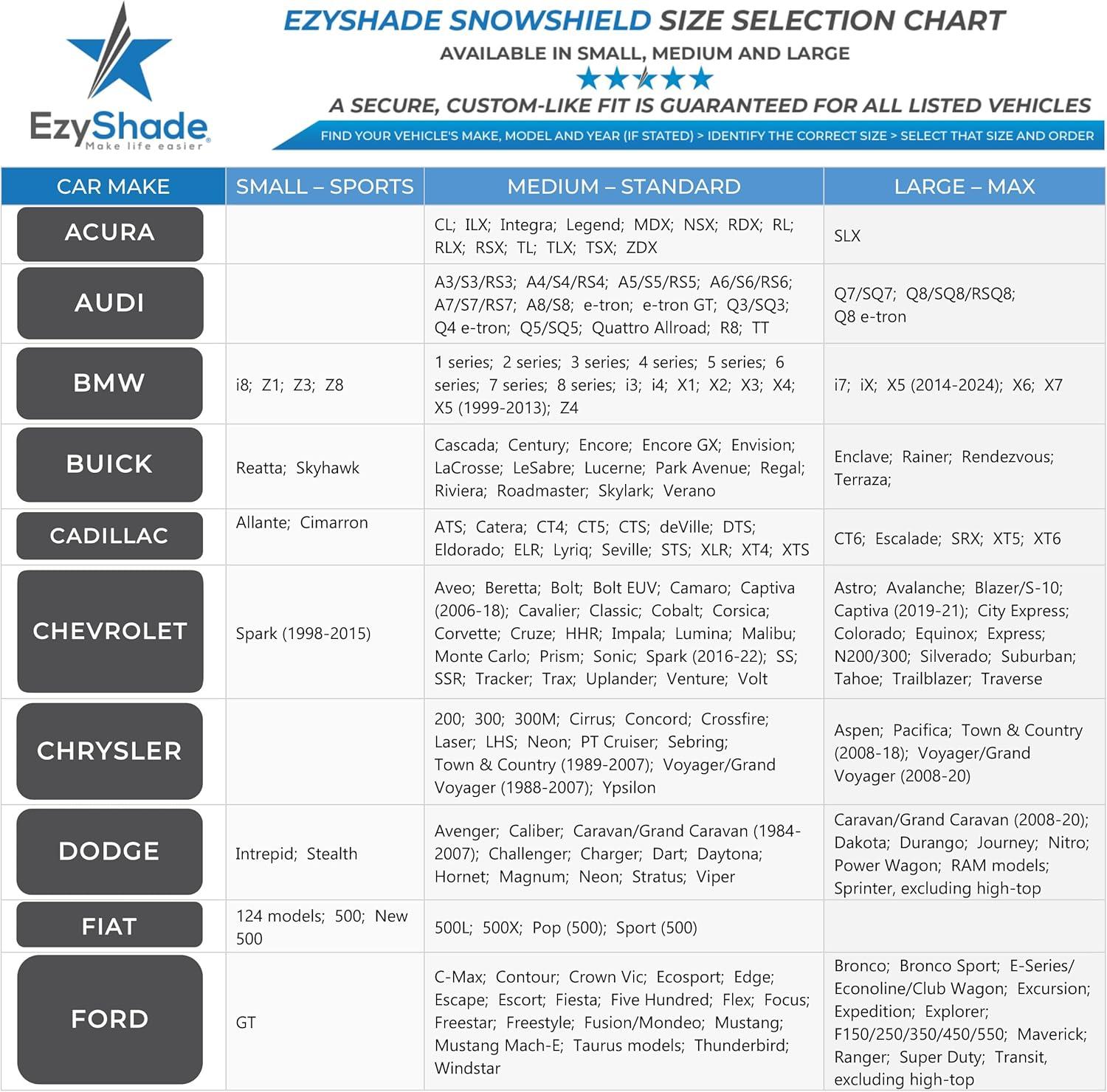 BEST FIT, BEST PROTECTION. Find your vehicle in the easy-to-read SIZE CHART. Don't persist with snow covers that are too tight or too floppy, EzyShade SnowShields achieve a custom-like fit for every vehicle in the size chart, guaranteed. See the Size Chart in images 4 to 6.